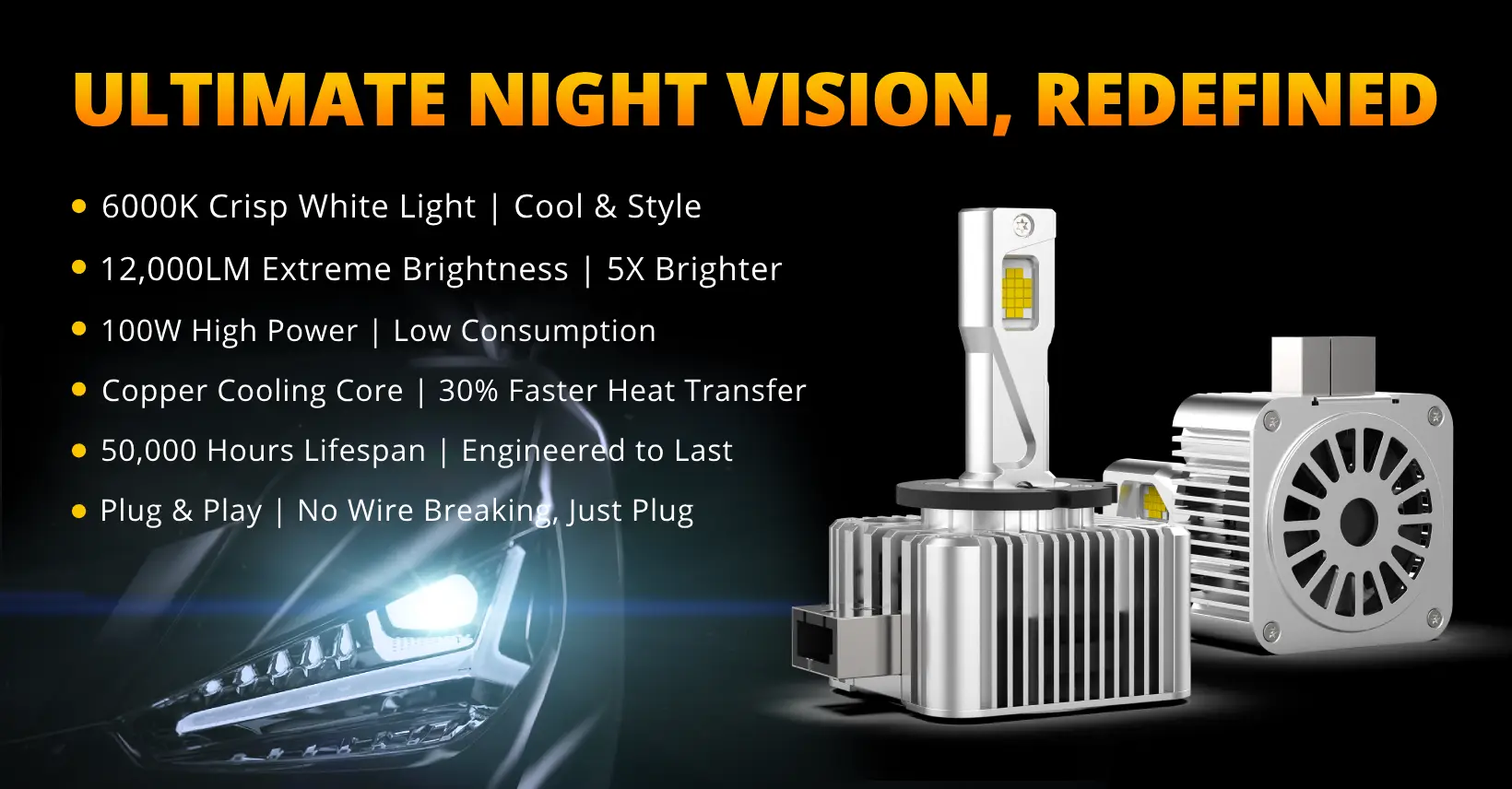 100W High Power, Low Consumption. Ultra-bright light for improved night driving and visibility, while using less energy than traditional halogens. This reduces strain on your vehicle’s electrical system. Robust Cooling System. A combination of a 10,000 RPM cooling fan and a copper cooling core ensures 30% faster heat dissipation, preventing overheating and maximizing the bulb’s lifespan. - Perfect Beam Pattern